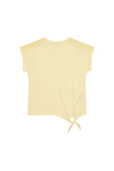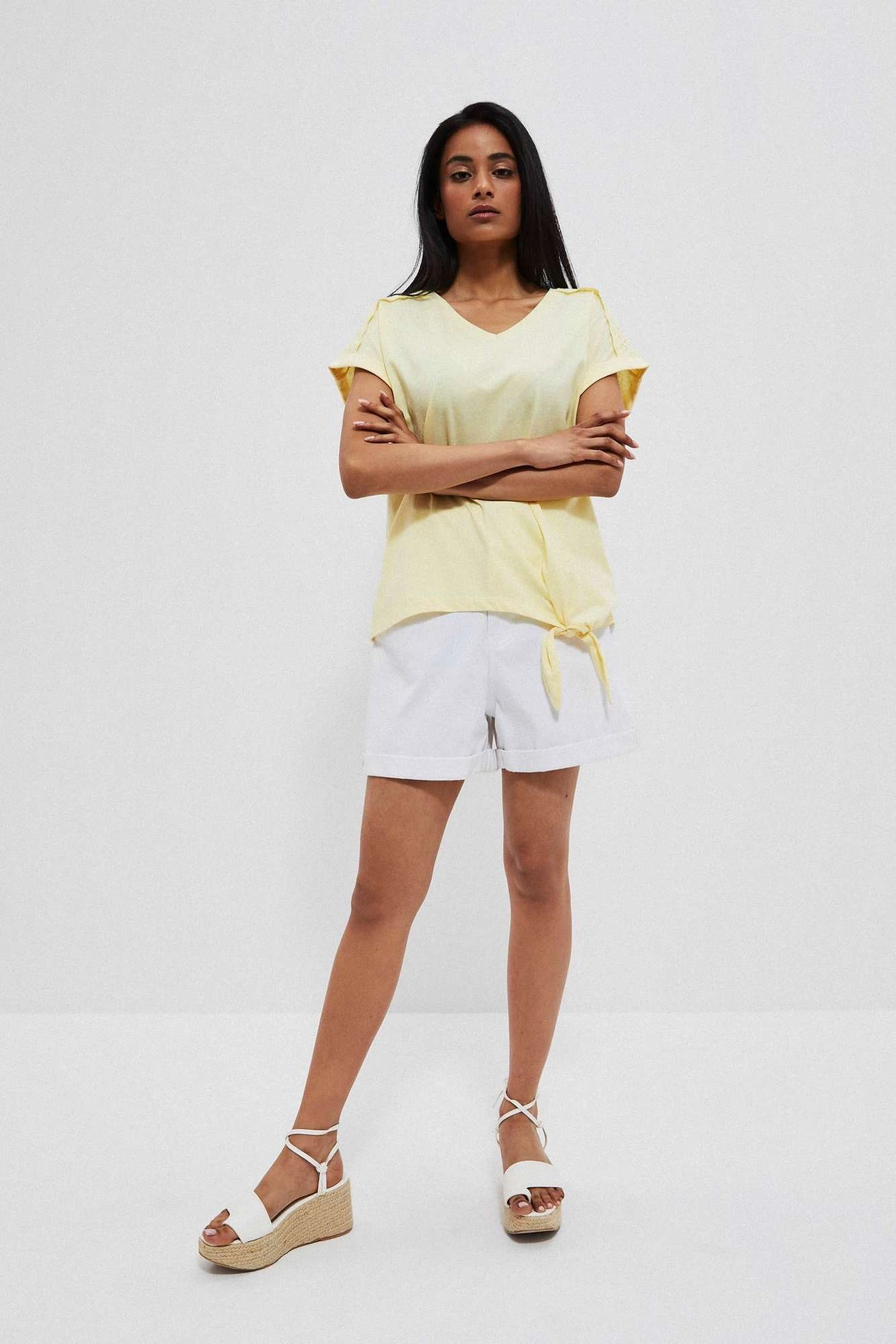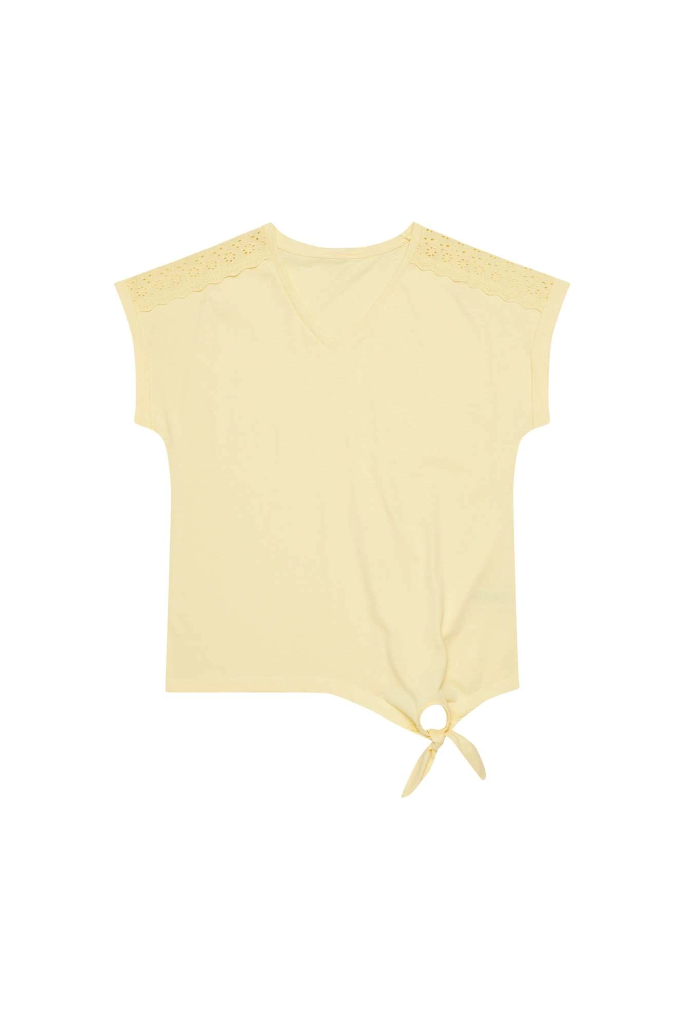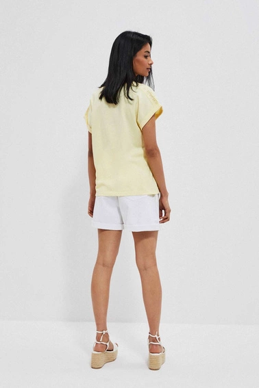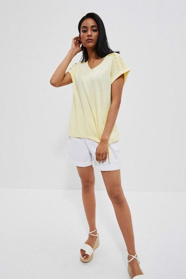 100% COTTON Lovely, yellow blouse with short, decorative sleeves. Plain cotton fabric, no pattern. Bottom edge with a binding. V-neckline. Loose cut perfect for summer!
