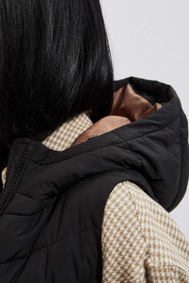 100% POLYESTER. Black quilted vest. Quilting in the form of diagonal stripes. Smooth, no pattern. Deep hood to protect against the cold. Sewn-in lining. Two front pockets to keep your hands warm or to store small items. Fastened with a zipper. Oversize cut. Mid-thigh length. Choose a warm sweatshirt and enjoy the autumn look.