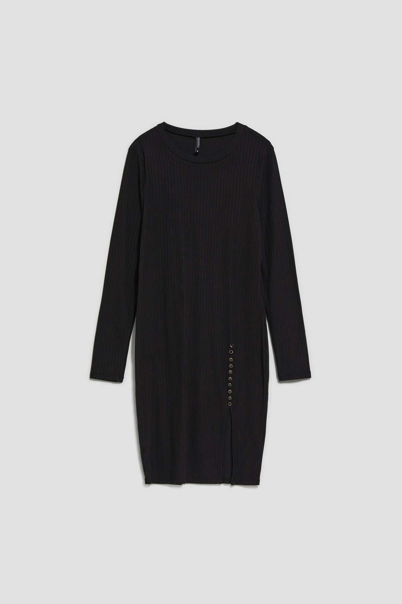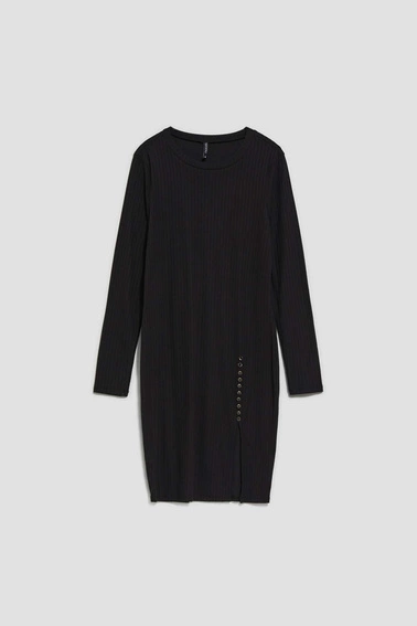 95% POLYESTER, 5% ELASTANE. Fitted feminine dress. Made of ribbed fabric. Smooth, no patterns. Round neckline, high up to the neck. Fitted cut, emphasizing the silhouette. Long and tight sleeves. Length above the knee. The fly adds femininity and sex appeal, decorative buttons above the fly. The dress is perfect for a date or meeting with friends.