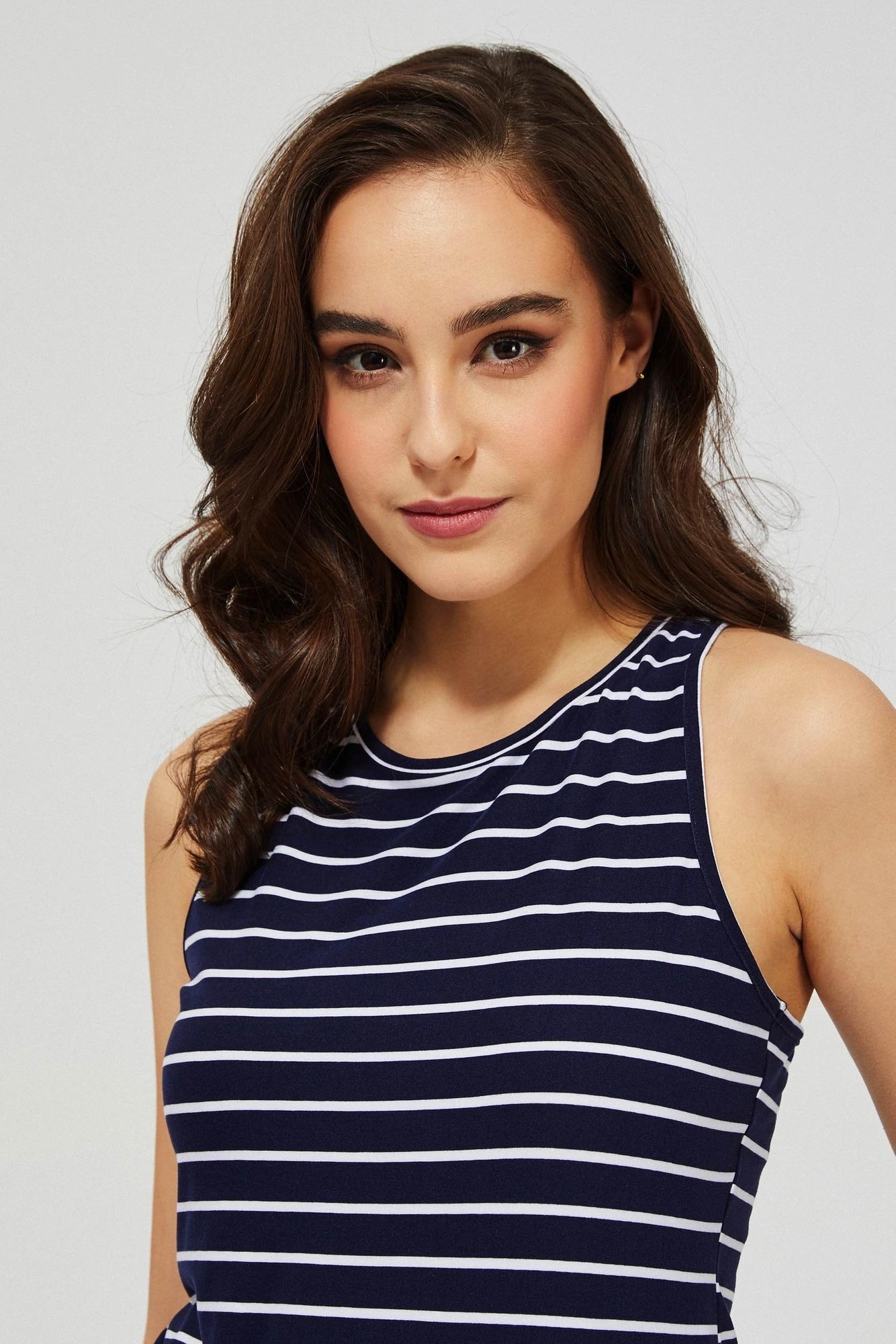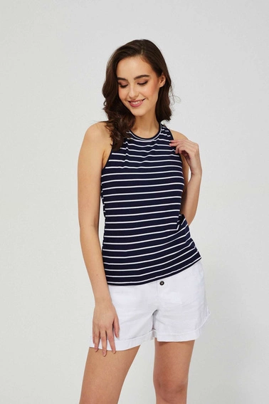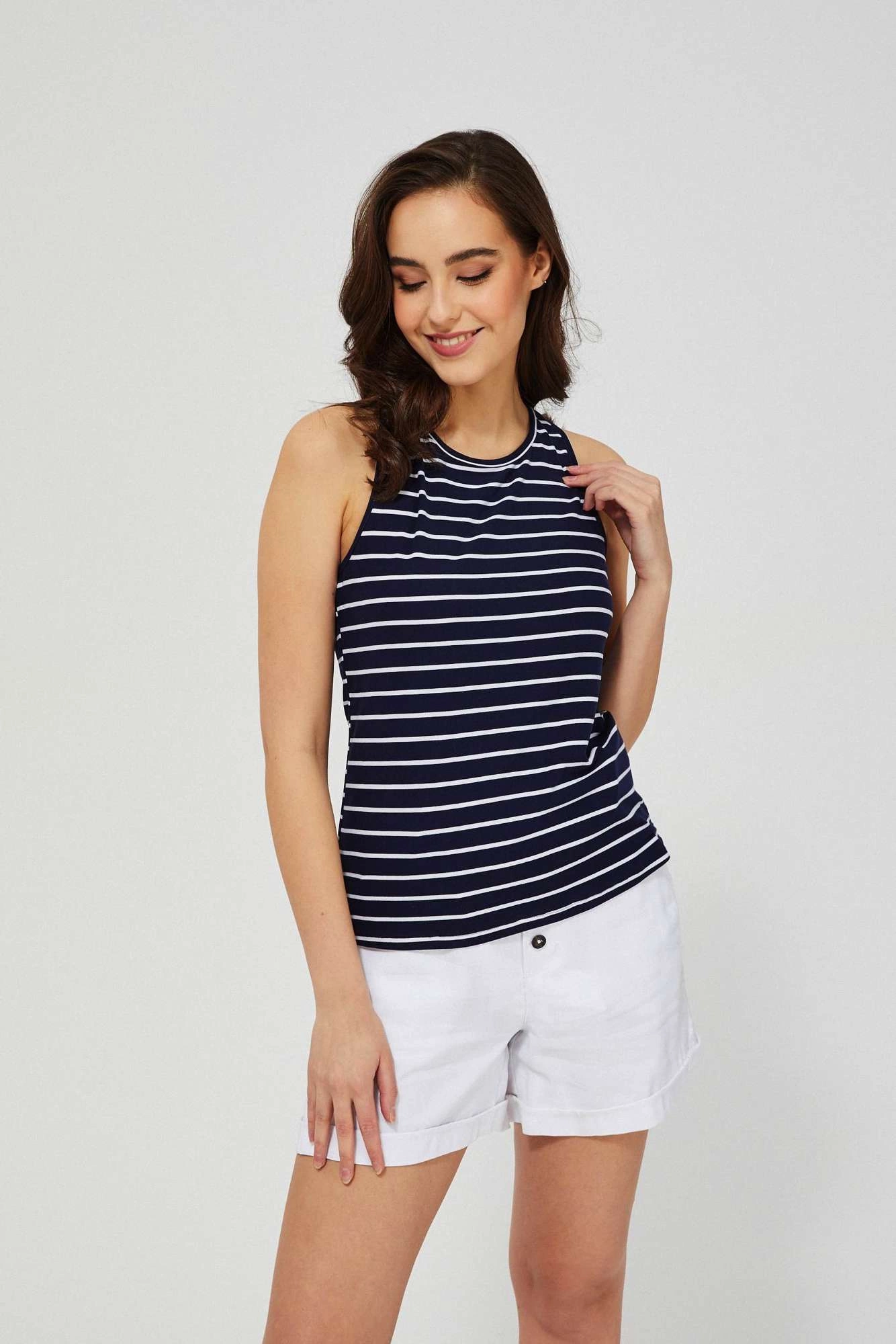 Bluzka, top, biały, granatowy, niebieski, paski, poliester, Bokserka, bez rękawów, na ramiączkach, Dekolt okrągły, wiązanie na plecach,