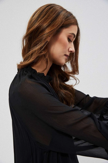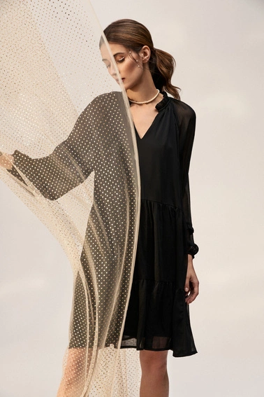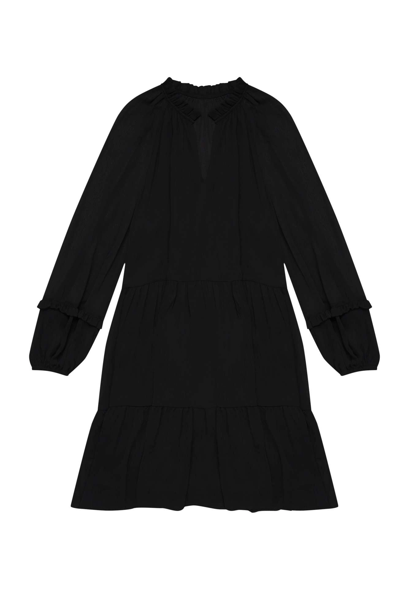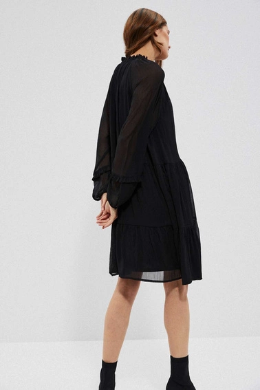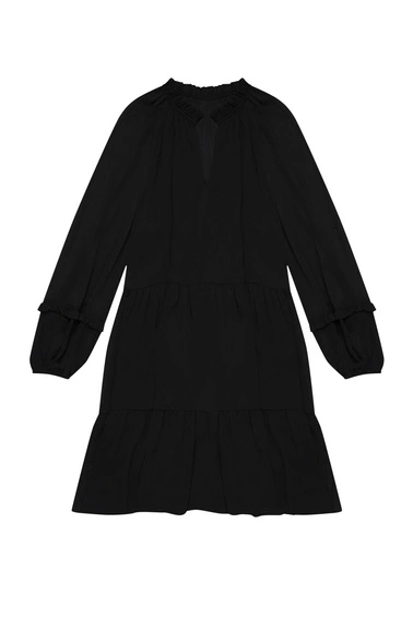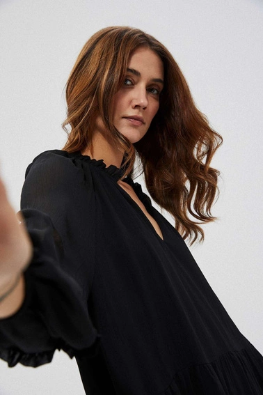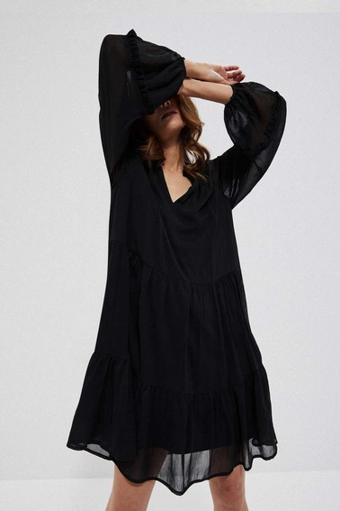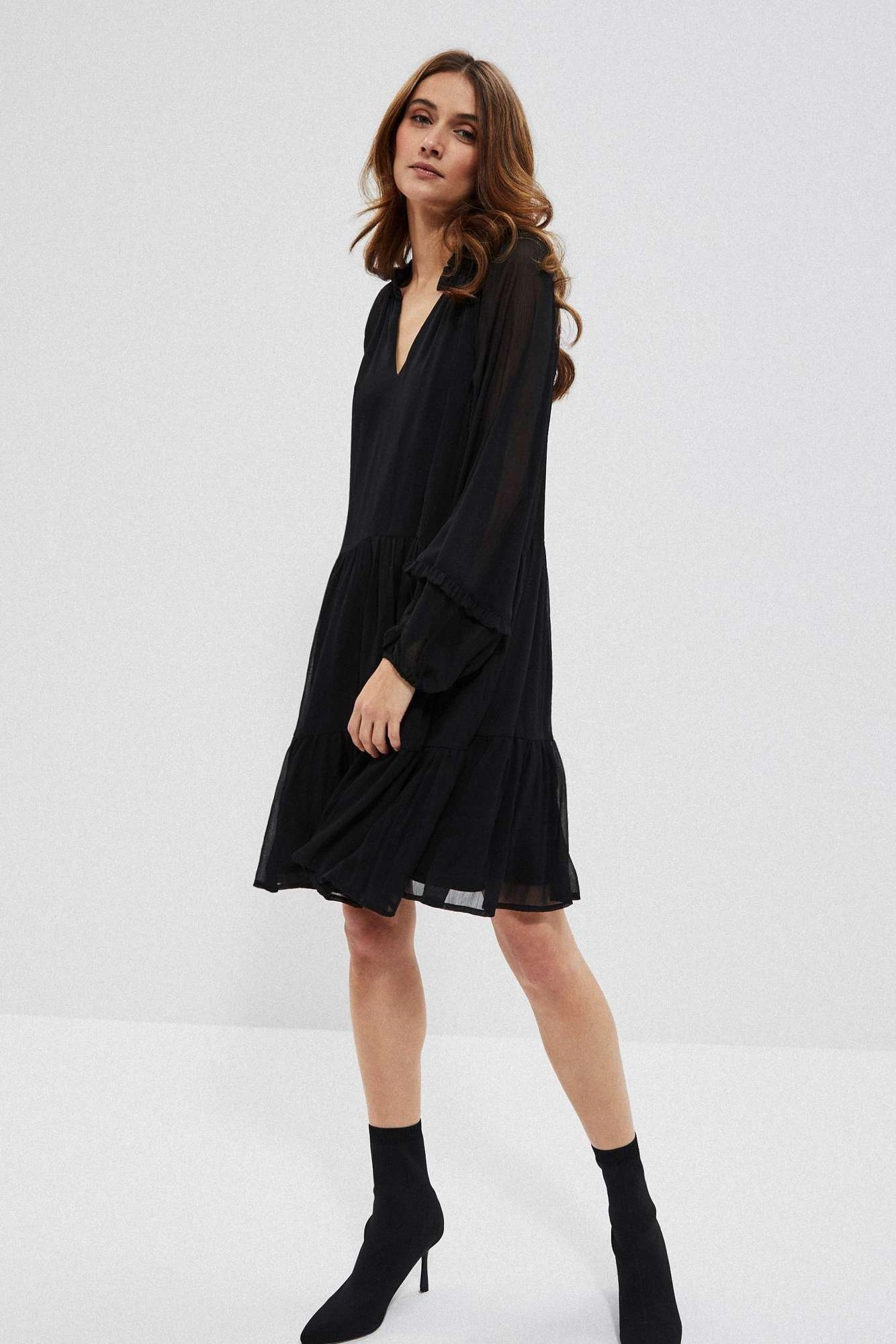 Sukienka, czarny, bez wzoru, gładki, Poliester, bufki, mankiety, z podszewką, falbana, casual, rozkloszowana, oversize, na co dzień, do pracy, Dekolt, w serek ( V neck), okrągły, brak, w kolano