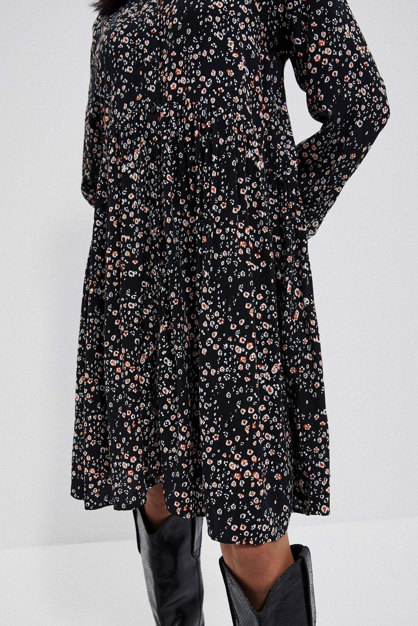 SUKIENKA, Kolor czarny, beżowy, ecru, kropki, Materiał_dominujący-wiskoza, kołnierzyk, marszczenia, guziki, casual, rozkloszowana, do pracy, na co dzień, zapięcie na kołnierzyk, długość guziki