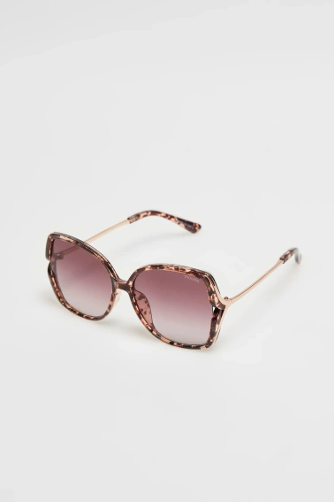Okulary damskie w kolorze beżowym. Wykonane z plastiku z dodatkiem metalowych detali. Posiadają gradalne szkła, o kształcie muchy.