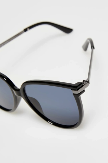 Okulary damskie o kocim kształcie. Czarny kolor, bez wzoru, gładka powierzchnia. Wykonane z wysokiej jakości poliwęglanu, z elementami z plastiku i metalu.