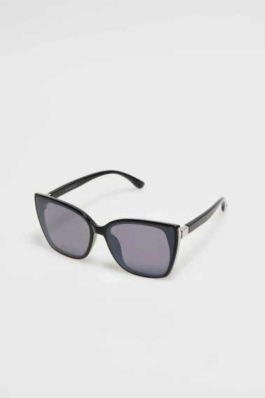 Okulary damskie w kolorze czarnym, bez wzoru, gładkie, z metalowymi elementami, barwione na czarno. Model w kształcie kanciastych okularów typu kociego oka.