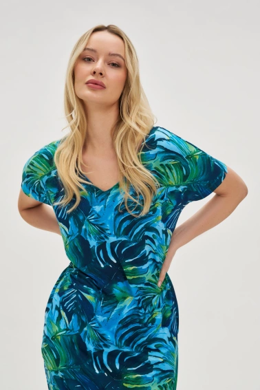 Sukienka wykonana z wysokiej jakości bawełny, dostępna w modnych odcieniach niebieskiego z motywem liści oraz różnorodnymi wzorami. Prosty fason z dekoltem w serek, długość przed kolano i praktyczne kieszenie sprawiają, że doskonale sprawdza się zarówno na co dzień, do pracy, jak i na plażę. Model idealny dla kobiet ceniących wygodę i casualowy styl.