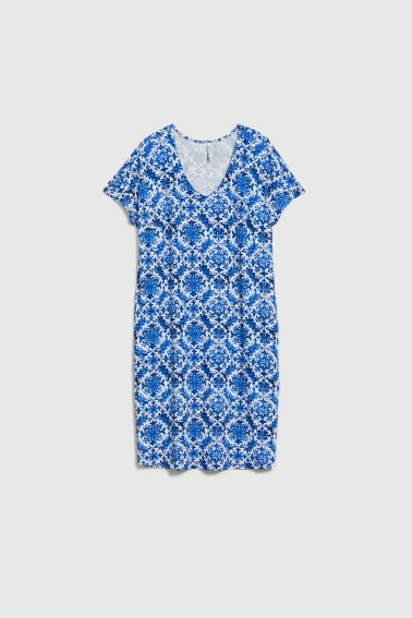 Sukienka o prostym fasonie, wykonana z bawełny, łączy w sobie komfort i funkcjonalność. Geometryczny wzór w odcieniach granatu i niebieskiego, nadaje wyrazistości codziennym stylizacjom. Długość przed kolano oraz praktyczne kieszenie sprawdzą się zarówno w pracy, jak i podczas codziennych aktywności . Dekolt w serek podkreśla kobiecy charakter modelu, zapewniając swobodę i lekkość noszenia. Idealny wybór na sezon casualowy.