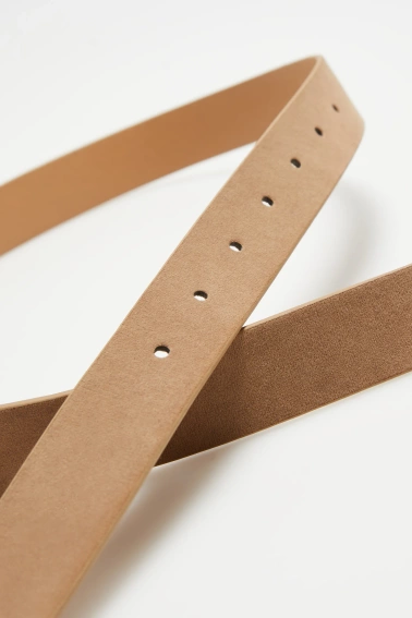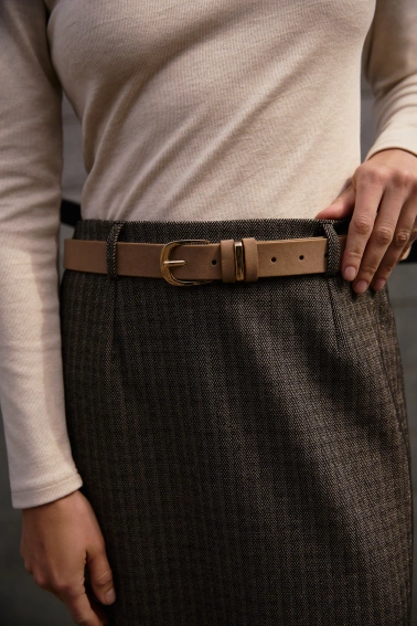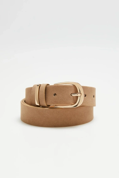 Beżowy pasek wykonany z wysokiej jakości poliuretanu, ozdobiony efektowną, złotą klamrą oraz dekoracyjną szlufką. Gładka struktura i zamszowe elementy podkreślają elegancki charakter produktu. Uniwersalny dodatek, który doskonale sprawdzi się w damskich stylizacjach.